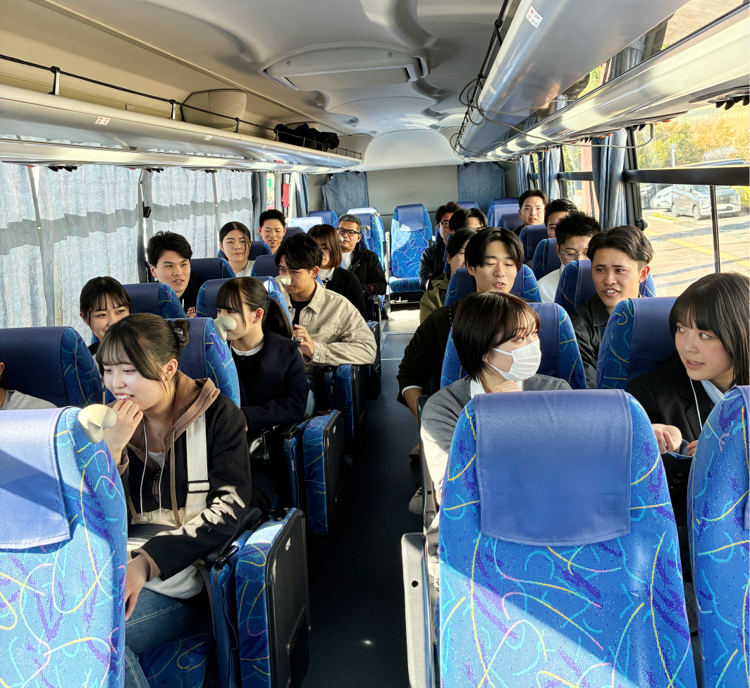 バスの中でもわいわい楽しく、先輩スタッフと内定者の皆さんの交流を図ります。